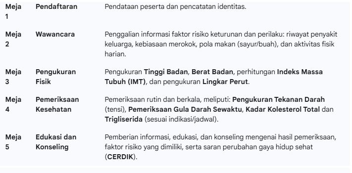 - Pelaksana: Melakukan wawancara dan pengukuran fisik sederhana (Tinggi Badan, Berat Badan, Lingkar Perut, Tekanan Darah).
